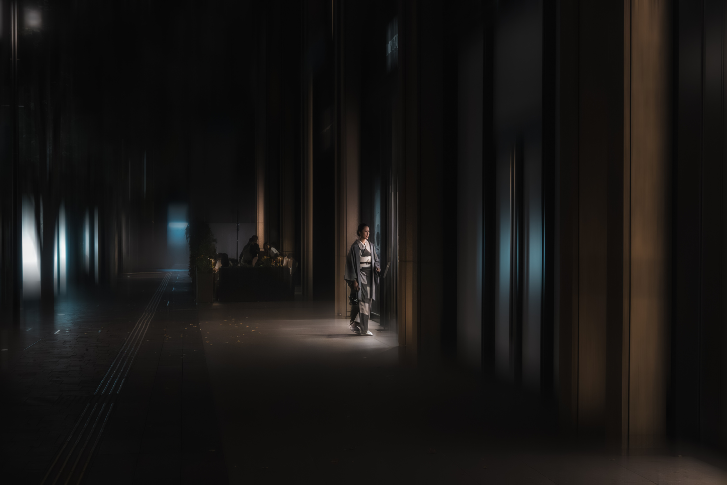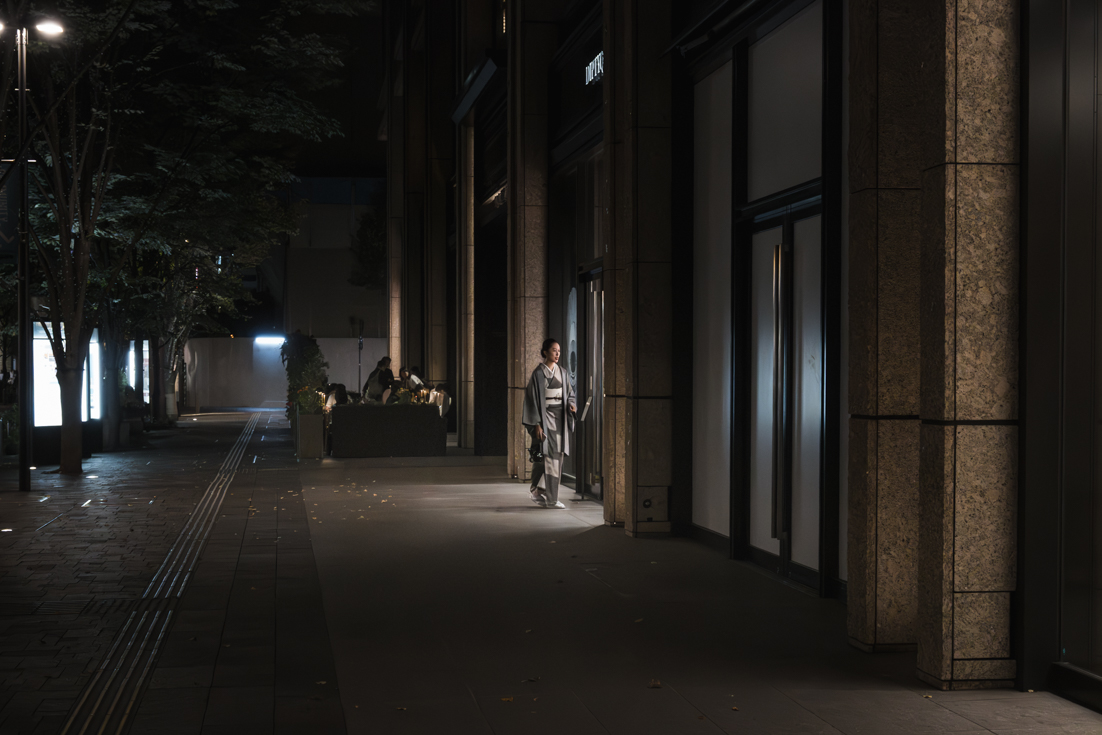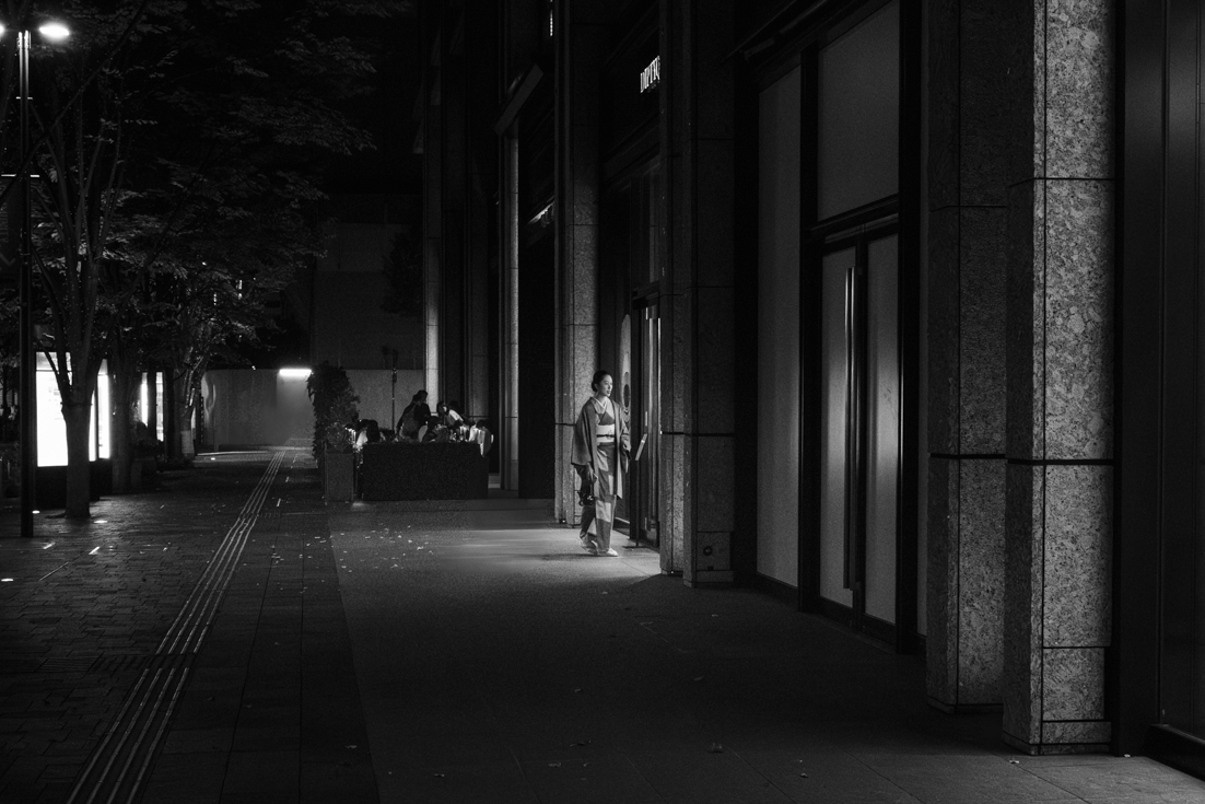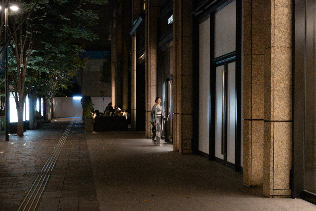 Initially, I thought about taking a photo of them. Then I saw a woman in a kimono walking towards the entrance of the restaurant on the terrace, so I decided to focus on her instead. I took several shots while the restaurant's lights spotlighted her.